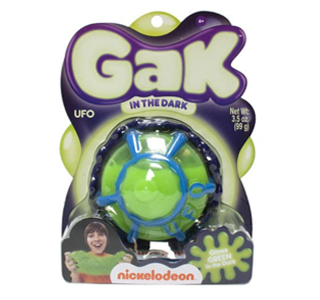 Nickelodeon Gak in the Dark- UFO. An excellent gift from your a friend, boyfriend, girlfriend or family member. This classic has been around for well over a decade and still entertains people. Enjoy this classic toy we all know as Gak!